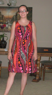 Well when the idea of her having a wedding shower came up, she wanted to wear the dress I had made her. She tried it on again and realized that she didn't really like the way that it fit. So she asked me if there was anyway that I could make it more fitted. I told her that she would actually have to let me measure her if the dress was going to fit correctly and she finally agreed. I decided to use the fabric from the dress and make a new dress from it. She said she wanted the bodice to be fitted and the skirt to be a-line and if possible to still have gathering at the neckline. I figured the coffee date dress on burdastyle.com was close and I figured out,through lots of pattern alterations, how to still have gathering at the neckline. Since my sister and I have very similar measurements, I decided to make the dress up for me to see if my alterations worked out before I cut into the original dress.
